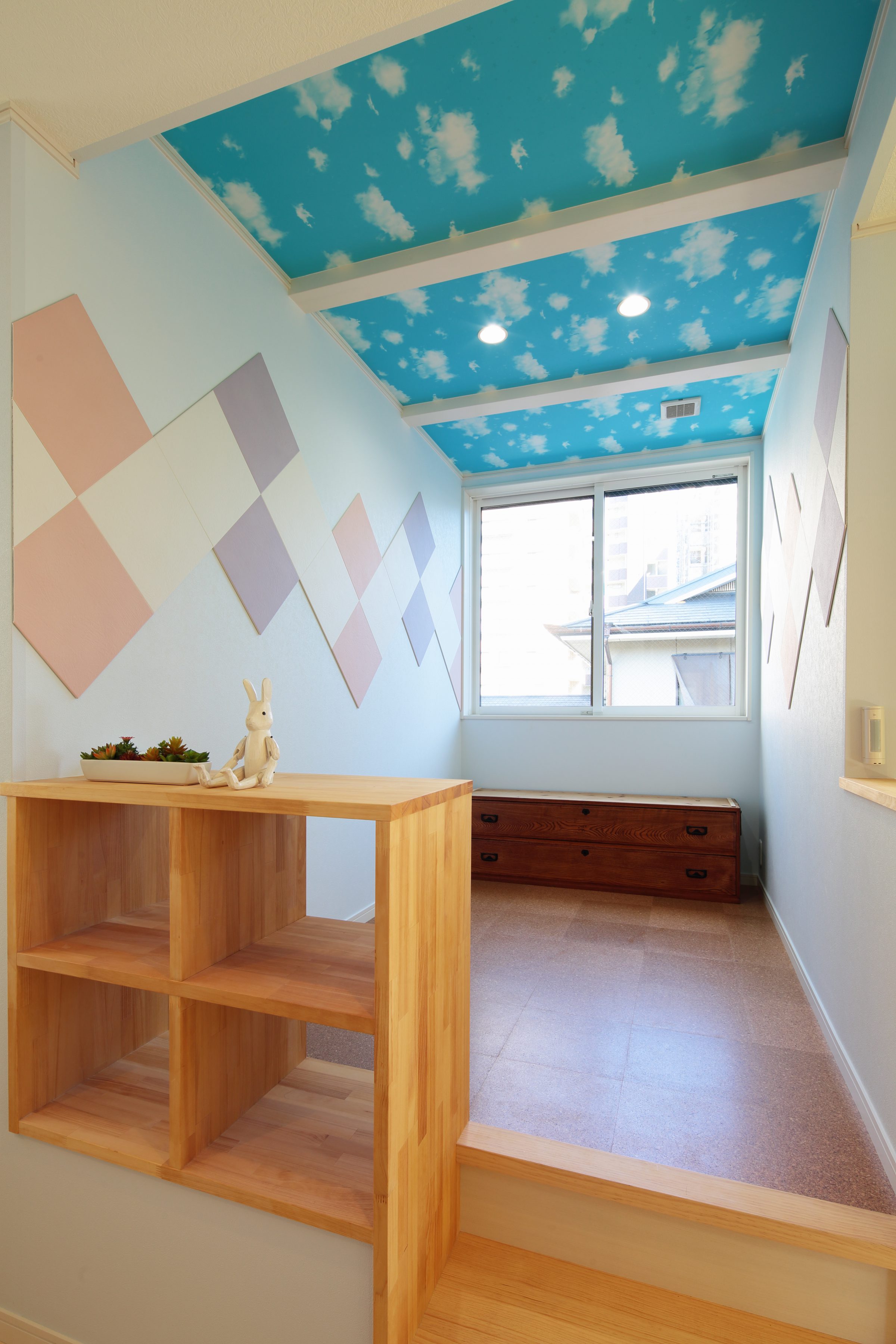青空の壁紙に、絵本やおもちゃの収納は造作で。