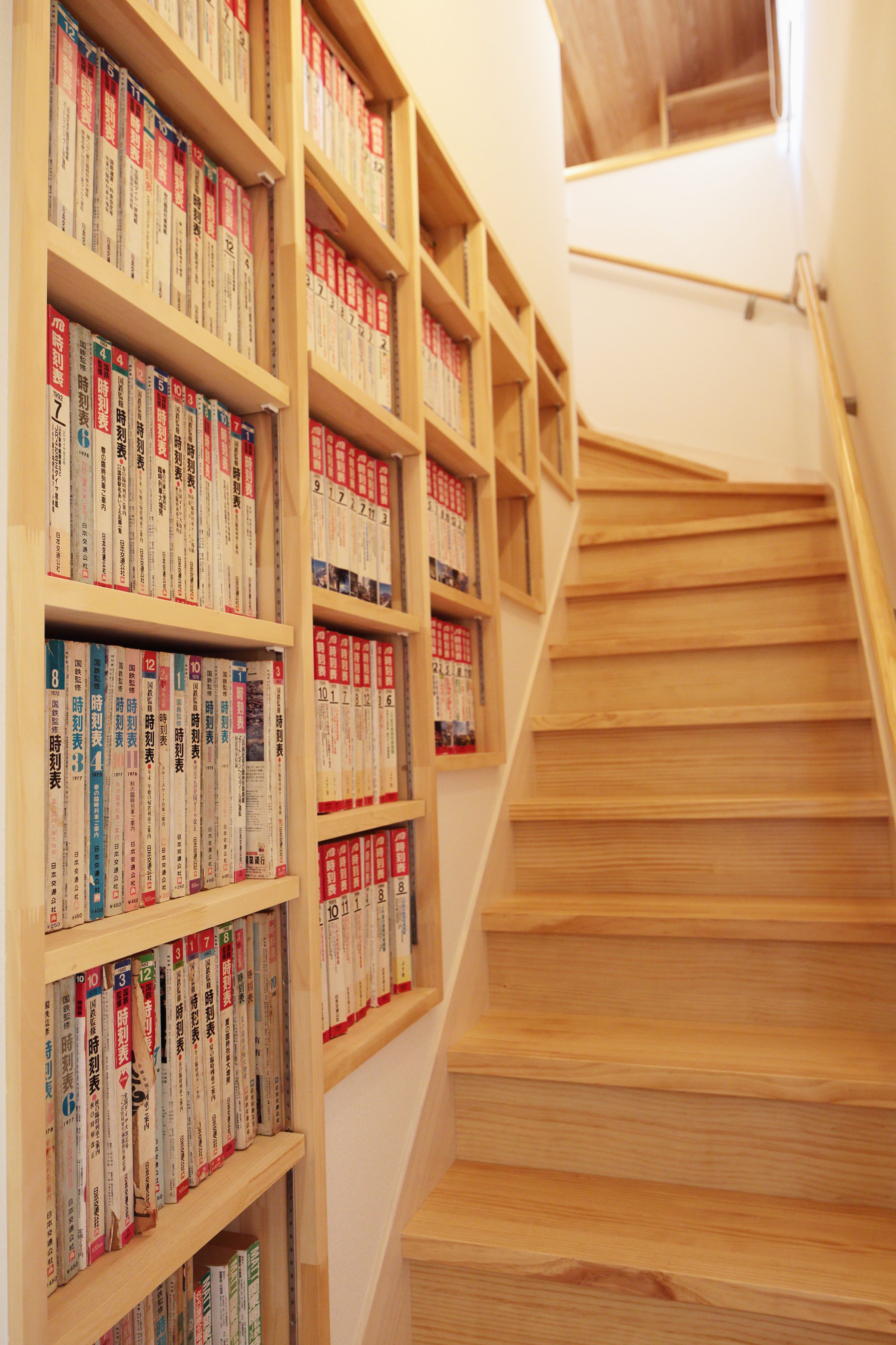 デッドスペースになりがちな階段の壁一面を本棚にしました。