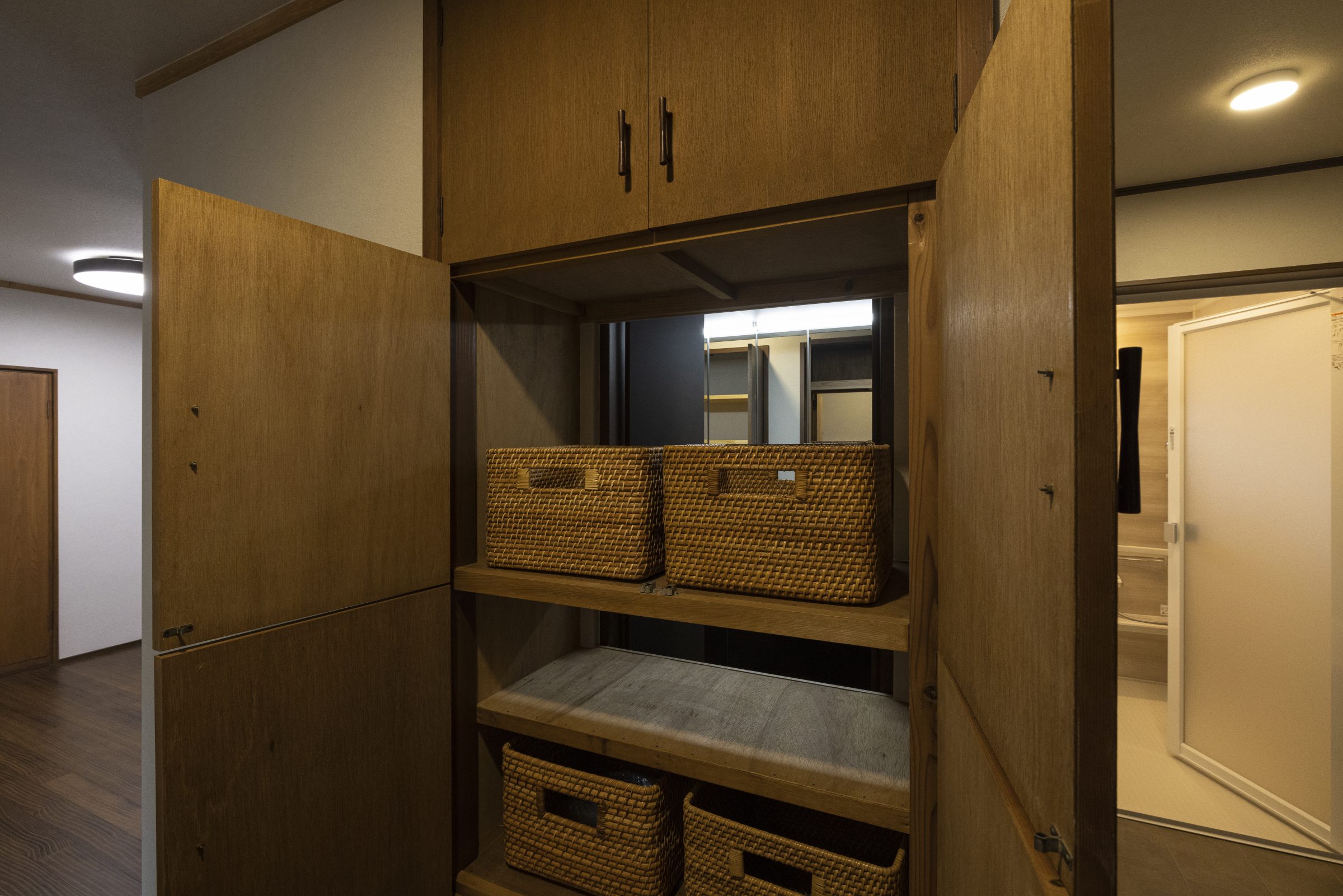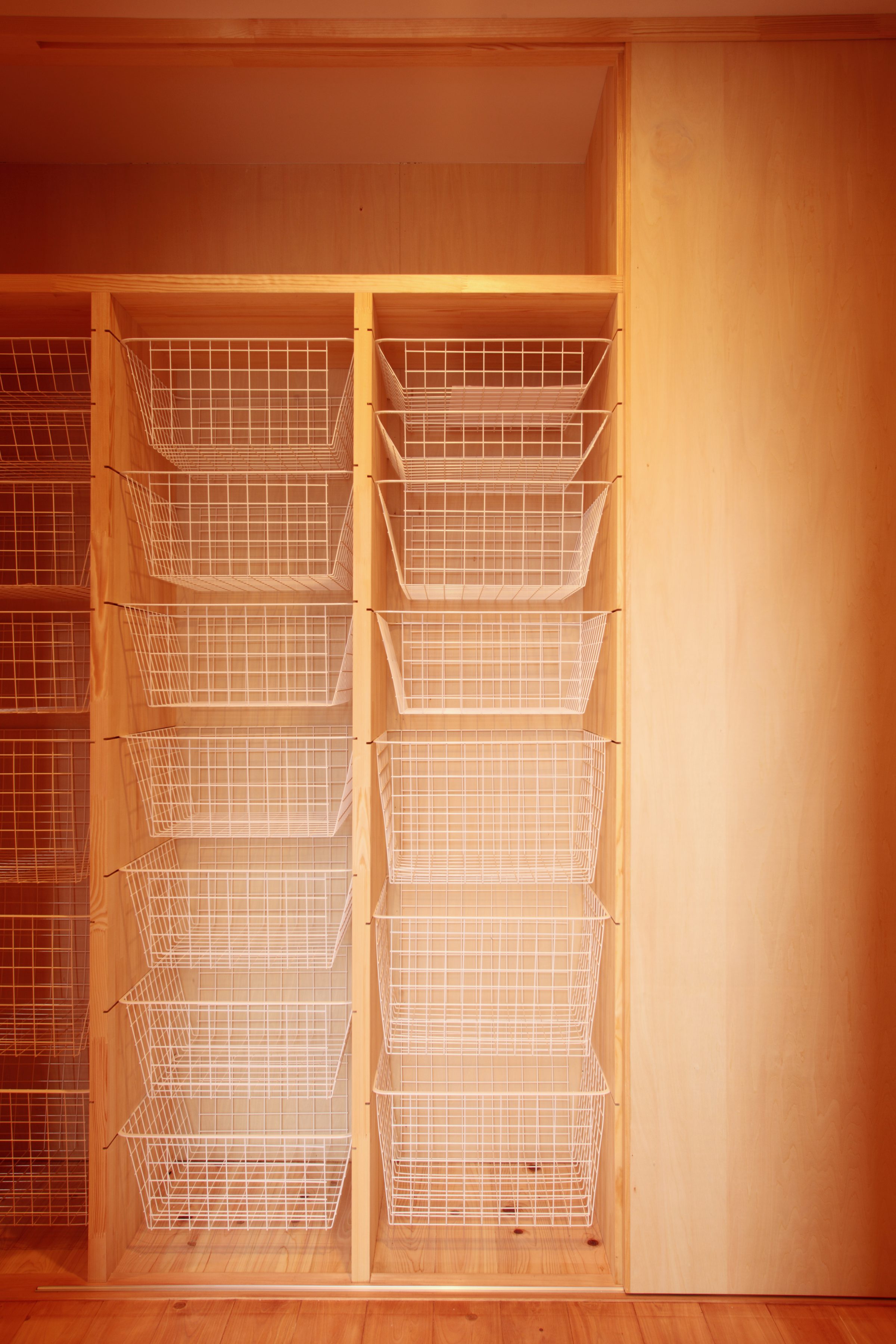 こちらは造作した棚枠に市販のカゴをセットしたオリジナル。