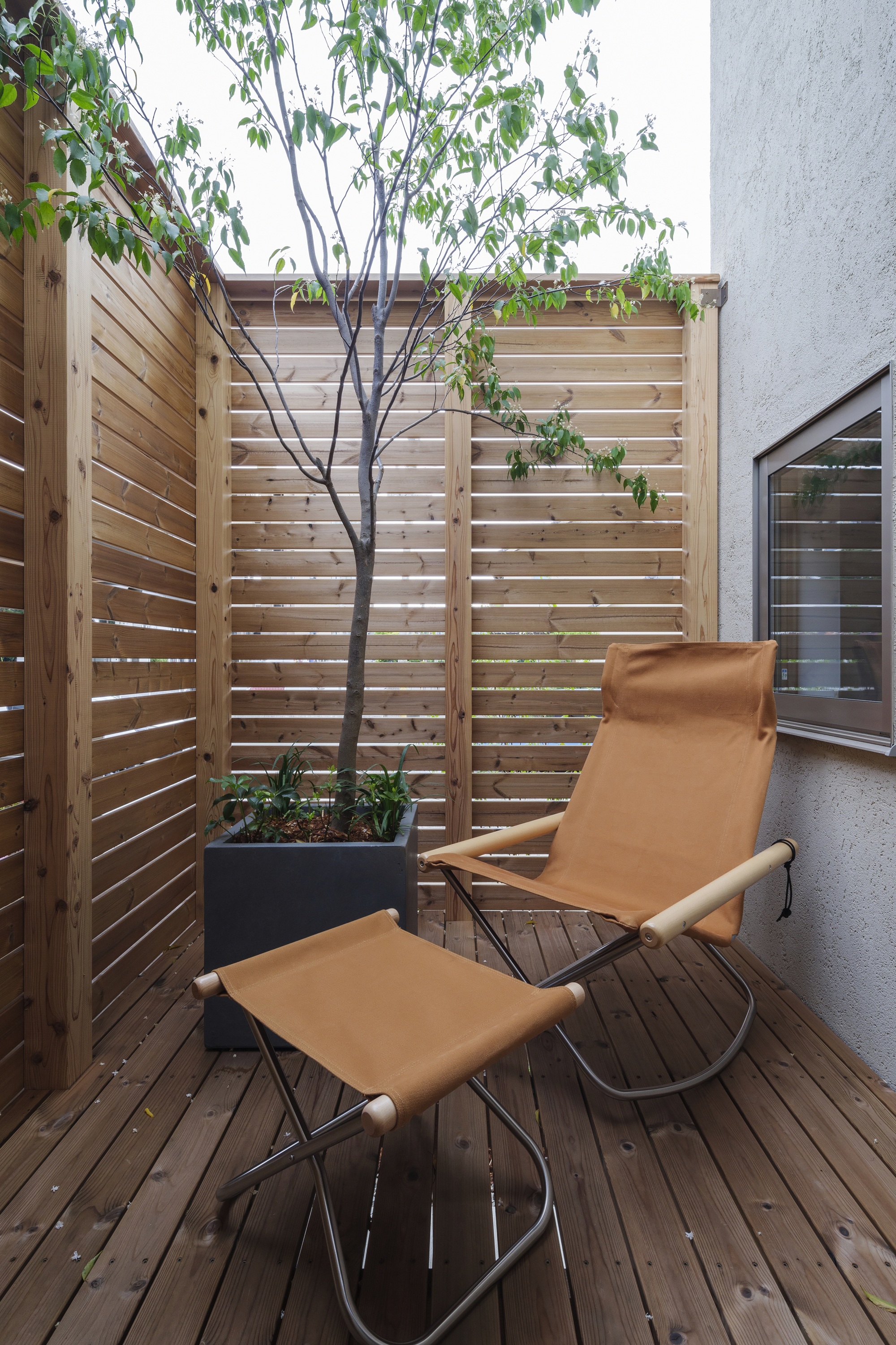 木塀で目隠ししたウッドデッキで開放感に浸りつつ、