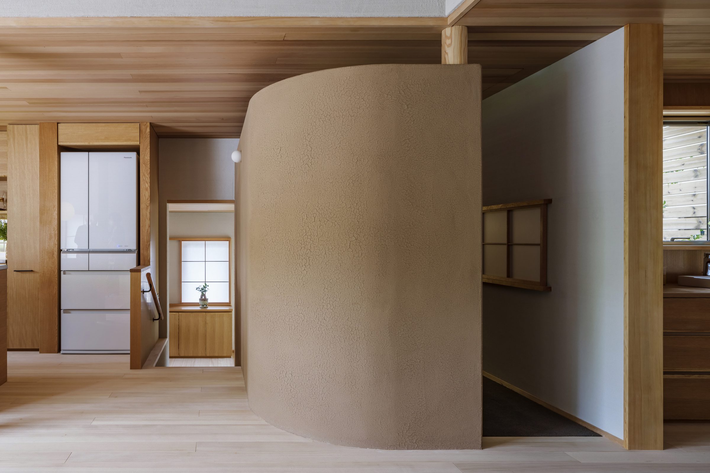 浮造りのモミの木やシラス塗りの壁、和の趣を醸す障子や瓦など、
