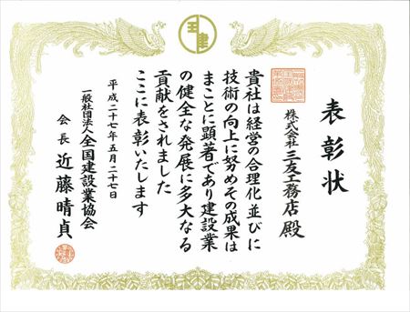 (一社)全国建設業協会から「経営の合理化並びに技術の向上に努める等、その成果は顕著である。」という内容で光栄にも会長表彰を受賞する事が出来ました。
