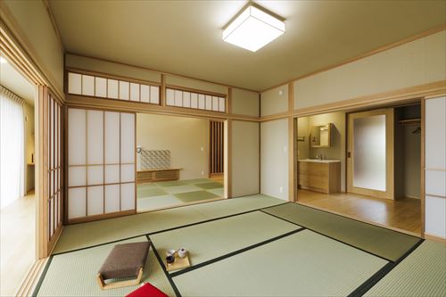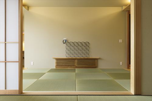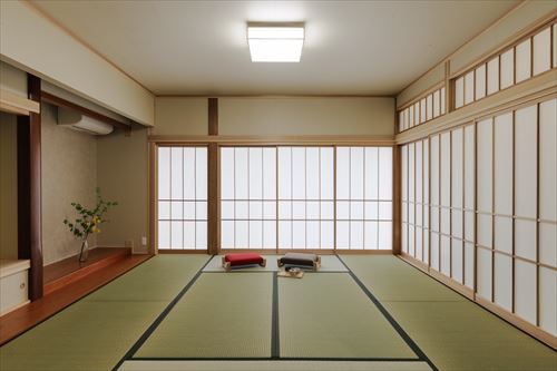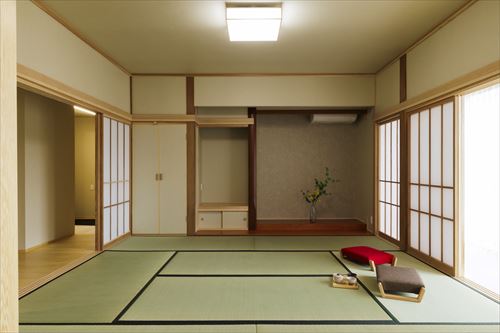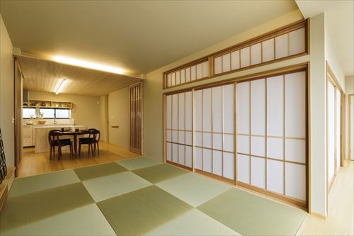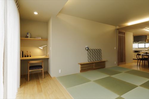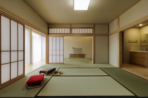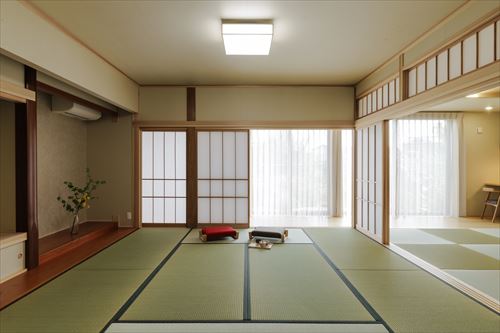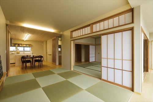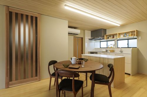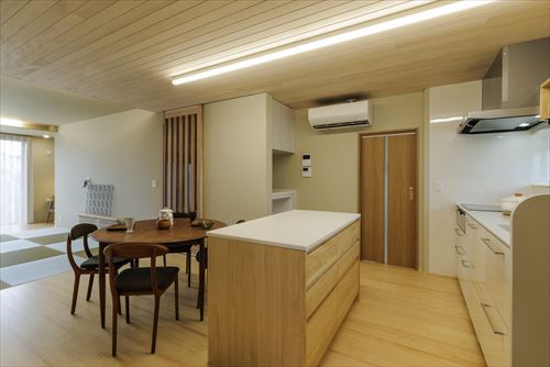 築45年の木造二階建て。和室が並んだ昔ながらの“田の字型”間取りを、家族が集まれる明るいLDKにリノベーションしました。キッチンは奥様と娘さんが料理やお菓子づくりを楽しめるよう、作業台も兼ねたカウンターを設け、パントリーも容量たっぷり。スタイルを選ばない畳リビングは、座ったり寝転んだり、みんなが自由にくつろげます。将来は平屋のように暮らせるように、主寝室や書斎といったプライベート空間も1階に置きました。また、仏間はあえて残して客間とし、親戚などの宿泊室として活用。洗面とトイレを近くに配置したことで“ゲストルーム”的な使い方ができるようにしています。(設計:一級建築士 内田智子)