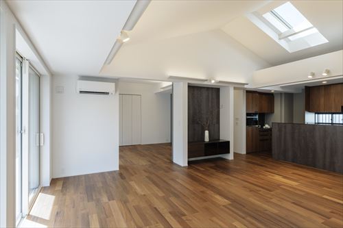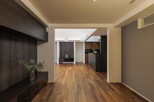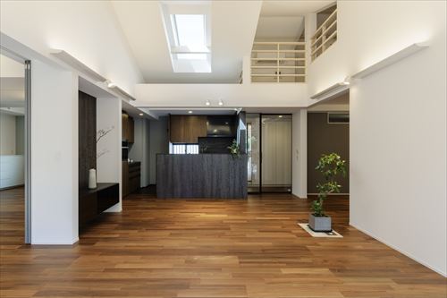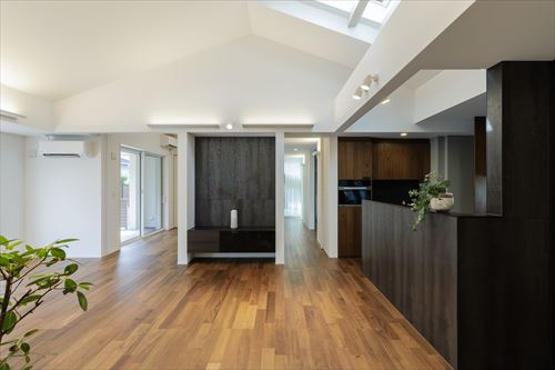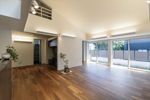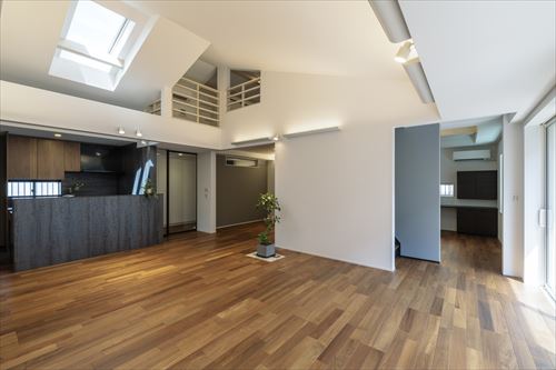 55坪の平屋ガレージハウス高天井の広いLDKを中心に、家全体を自由度の高い「ワンルーム」として捉えた平屋の住まい。今後の暮らしの中でフリースペースが趣味室やテレビ室となったり、帰省した子ども家族の宿泊室になったりと、年齢やライフスタイルに応じて色んな使い方ができます。