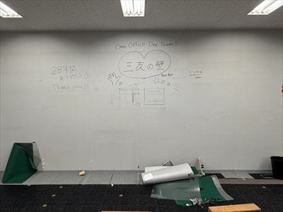 設計と工務を仕切っていた間仕切り壁を撤去することです。