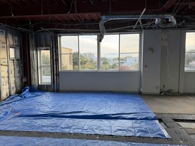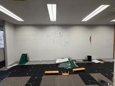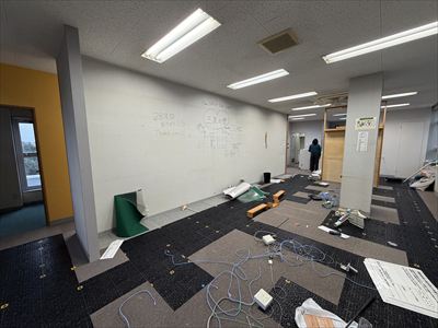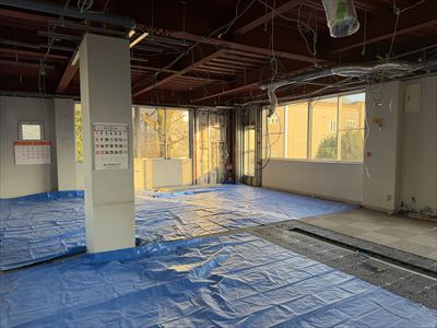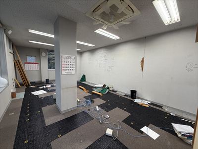 設計と工務の連携強化と情報共有の迅速化を目的とした、事務所2階の改修計画です。事務所ビルは築28年を迎え、当時のレイアウトのまま使い続けてきましたが、人数や業務の進め方の変化により使いづらさが生じてきました。今回の改修では、設計と工務を仕切っていた間仕切り壁を撤去し、部屋全体が見渡せるレイアウトへ変更します。これにより、同じ空間で同じ情報を共有し、相談や判断が自然に行える環境を整え、プロジェクト名のとおり「つながって、ひとつになる」職場づくりを進めていきます