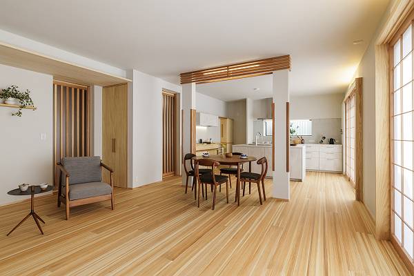 独立型のLDKを明るく開放感のあるワンルームに改修し、家族が自然と集まりやすい空間に。